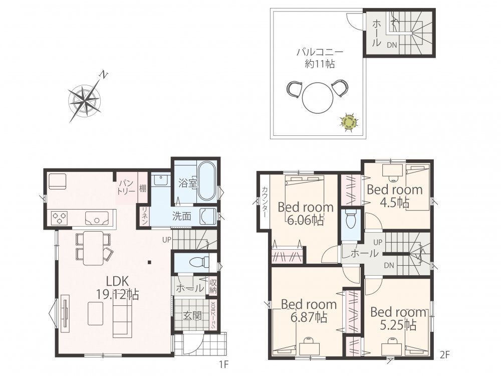 | 建物面積 | 94.77㎡〜98.00㎡ | 間取 | 3LDK ( LDK18.5帖 洋室11.25帖 洋室5.25帖 洋室6帖 ) |