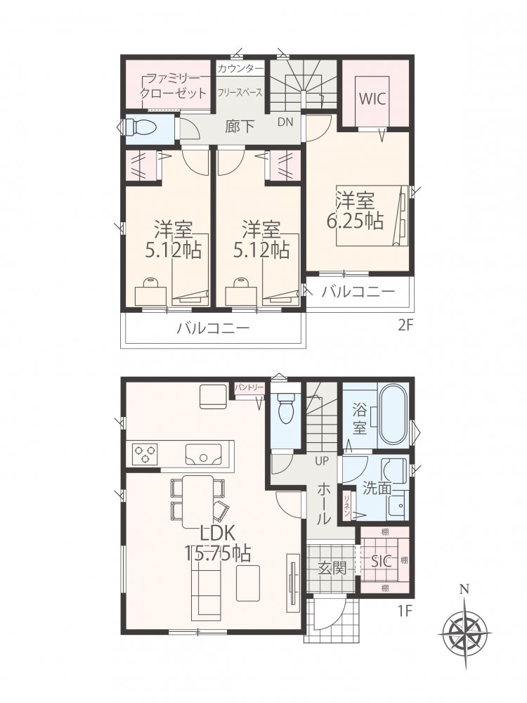 | 建物面積 | 85.86㎡〜97.60㎡ | 間取 | 3LDK ( LDK15.75帖 洋室6.25帖 洋室5.12帖 洋室5.12帖 ) |