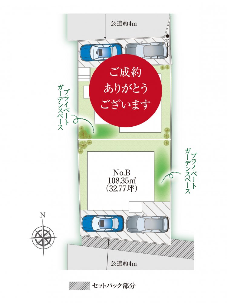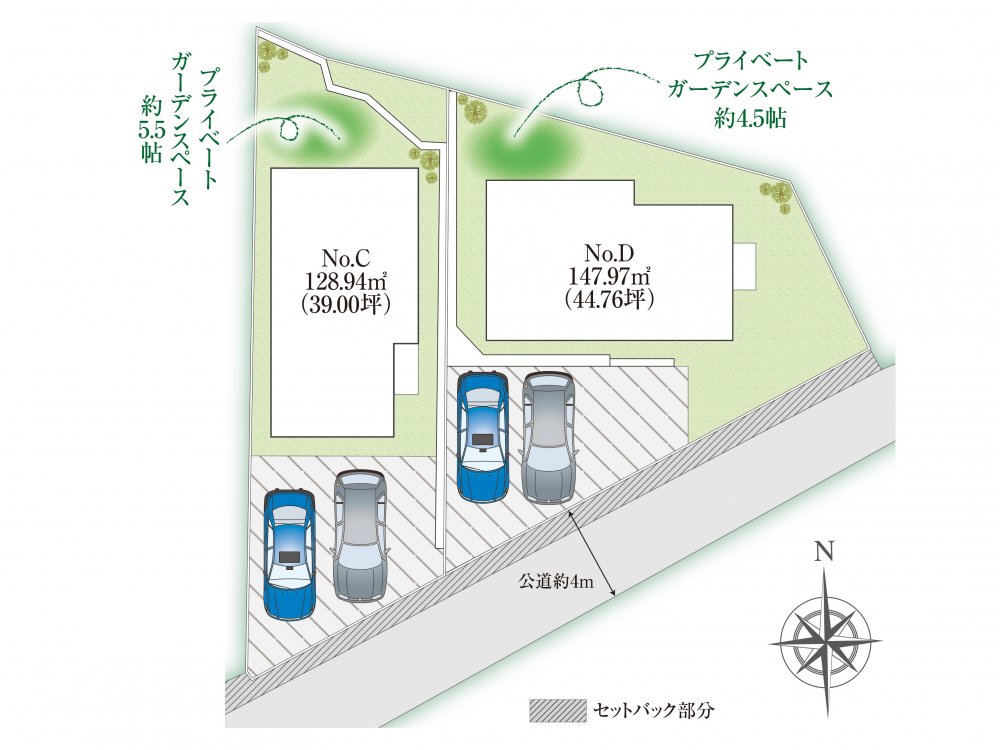 | 販売棟数 | 全8棟 今回販売6棟 | 土地面積 | 108.32㎡〜147.97㎡ |