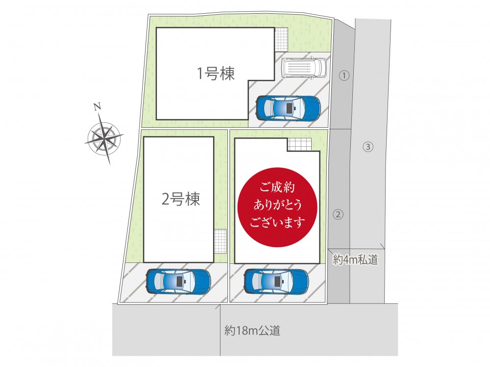 | 備考 | ①③号棟私道(46.34㎡)持分3分の1ずつ(区画図③部分)、道路使用に関する合意書有 | ||